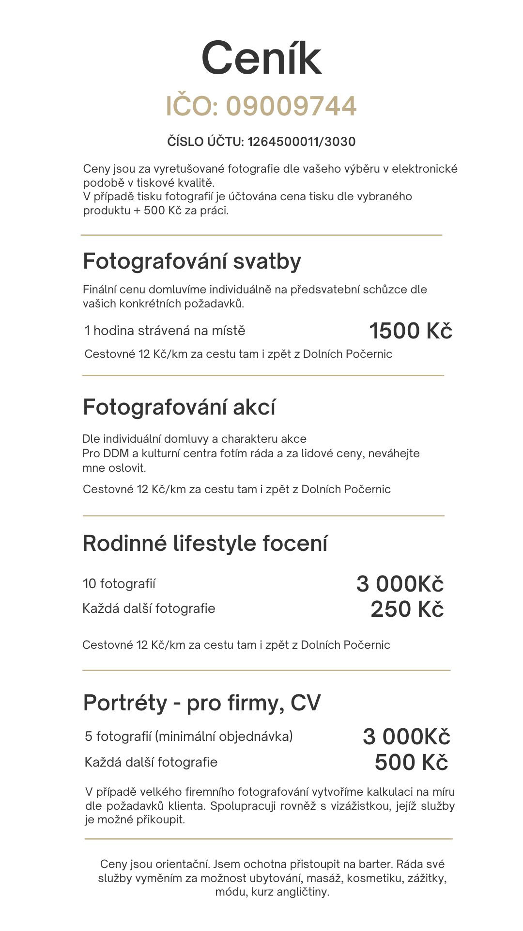 Ceny jsou za fotografie v tiskové kvalitě předávané v elektronické podobě formou zaheslované webové galerie. Galerie je vizuálně velmi hezká, můžete odkaz a heslo na ni rozeslat svým svatebním hostům nebo klientům, kteří mohou fotografie prohlížet bez nutnosti stahování.